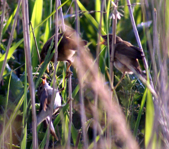 Below a Reed Warbler is feeding a caterpillar to two of its fledglings way down in the thicker undergrowth. These birds are well camouflaged.