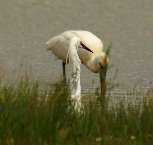 This is the Spoonbill, a real treat as it is labelled, in the bird book, as ENDANGERED. With its nearly 5' wingspan and long bill and legs it has a long elongated body in flight. An Avocet is feeding in the background.
