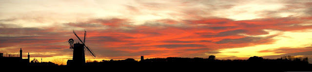 A few days back I felt it in my bones that the day was right, the time had come but the day was slightly too clear of cloud and this would provide nothing worth photographing. However I set off to Cley (about 10 miles north) on the chance that it might be the right day for that 'shot' and I was rewarded with an excellent sunset that ticked all the boxes. It lasted for nearly an hour through it's different phases, and at times the colours were intense especially with the telephoto lens just capturing the heart of the sunset. The fire red sky behind the church was stunning and I admit to taking over 300 photos in that short hour! There was only one other person there and he made the mistake of giving up when the sun dropped out of view. You see many people don't realise that this is often when the sunset develops into the best show of all as the sun is now low enough to illuminate the lower clouds at an angle meaning that the sunlight is struggling through the Earth's atmosphere acting as a giant filter. It was at this point that the intensity became full on and the sky behind the church looked as though it was on fire. The next day also looked promising and so I took Alison with me and once again we were treated to a stunning show of colours with the light behind the church this time being a rich Golden colour, turning to sepia then red then pink then purple as it faded into night. Every tree, every branch, every twig and every bird in the sky was emphasized by this rich incandescent backdrop of gold. All the time in the marshes all around the Curlews and Pheasants and Moorhens called and croaked and the sky opposite the sunset was soaked with a cool gentle subtle tincture of pink, as the blushing naked night revealed herself.......